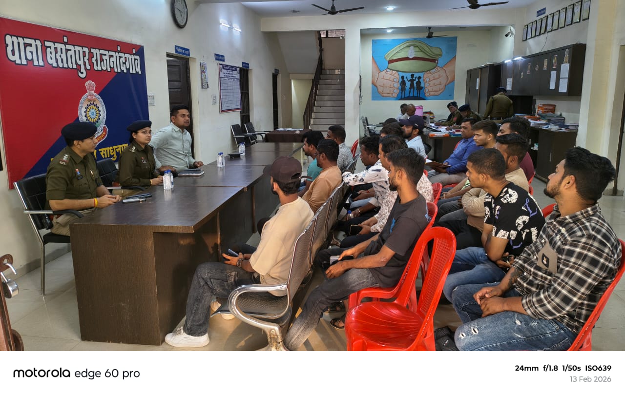 राजनांदगांव। पुलिस अधीक्षक सुश्री अंकिता शर्मा के निर्देशानुसार, नगर पुलिस अधीक्षक श्रीमती वैशाली जैन ने आगामी होली पर्व और बोर्ड परीक्षा को ध्यान में रखते हुए थाना बसंतपुर में डीजे संचालकों की बैठक आयोजित की। बैठक में एसडीएम गौतम पाटिल, थाना प्रभारी निरीक्षक एमन साहू और क्षेत्र के डीजे संचालक उपस्थित रहे।