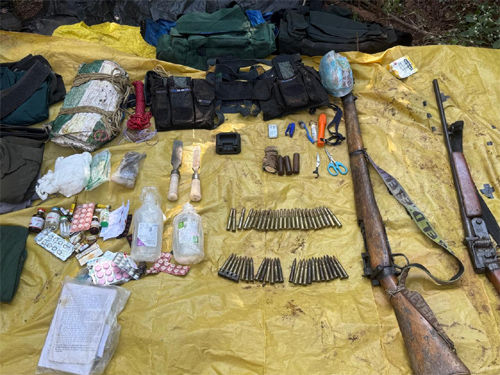 बरामद सामग्री में इंसास एलएमजी रायफल 01 नग, 303 रायफल 02 नग (58 जिंदा राउंड), 12 बोर गन 01 नग (25 राउंड), बीजीएल 01 नग (05 सेल में 04 जिंदा एवं 01 खाली), वर्दी कपड़े 02 सेट, पोच 02 नग, पिट्ठू 02 नग, तिरपाल, मेडिकल सामग्री, नक्सली साहित्य एवं अन्य सामग्री शामिल है।
