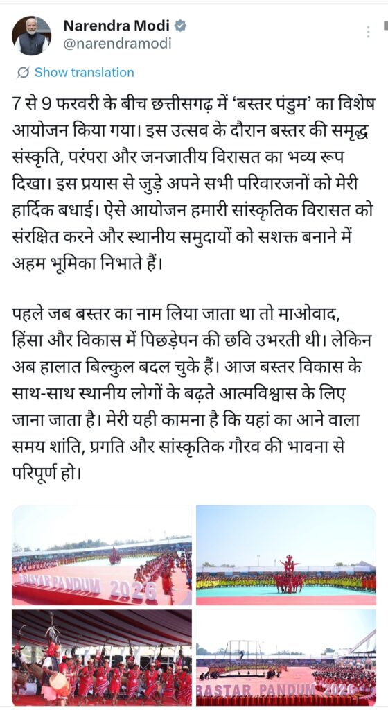 अपने पोस्ट में पीएम मोदी ने बस्तर की बदलती तस्वीर का भी जिक्र किया। उन्होंने लिखा कि एक समय बस्तर का नाम लेते ही माओवाद, हिंसा और पिछड़ेपन की छवि उभरती थी, लेकिन अब परिस्थितियाँ तेजी से बदल रही हैं। आज बस्तर विकास और स्थानीय लोगों के बढ़ते आत्मविश्वास के लिए पहचाना जा रहा है। प्रधानमंत्री ने आशा जताई कि आने वाला समय शांति, प्रगति और सांस्कृतिक गौरव की भावना से परिपूर्ण होगा।