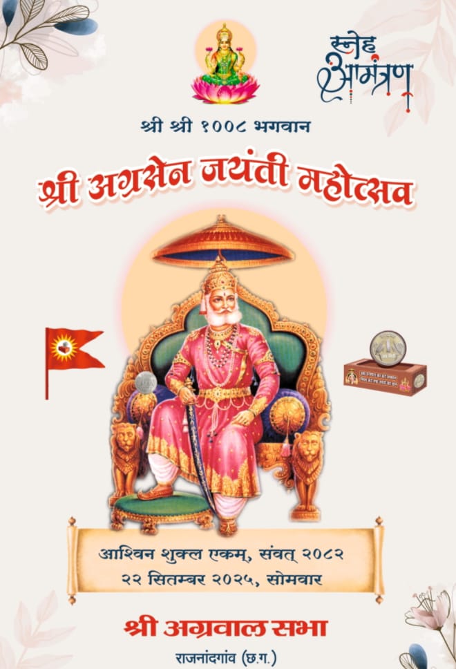 राजनांदगांव। अग्रकुल प्रवर्तक भगवान श्री अग्रसेन जी की 5149 वीं जयंती आगामी अश्विन (क्वांर ) शुक्ल एकम,22 सितंबर 2025 सोमवार को परंपरागत श्रद्धा, भक्ति एवं उल्लास के साथ मनायी जायेगी । इसी दिन आदिशक्ति मां दुर्गा की उपासना का पर्व नवरात्र आरंभ होगा।