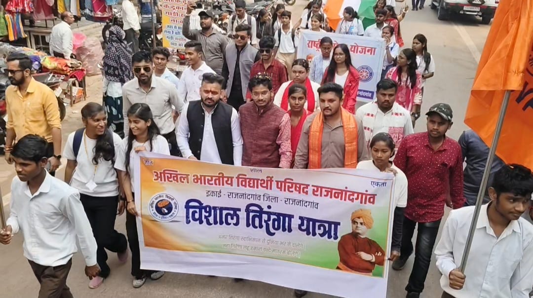 राजनांदगांव। भारत माता के प्रति समर्पण और राष्ट्रभक्ति की भावना को जन-जन तक पहुँचाने के उद्देश्य से अखिल भारतीय विद्यार्थी परिषद (एबीवीपी) राजनांदगांव इकाई द्वारा वंदे मातरम् के 150 वर्ष पूरे होने के ऐतिहासिक अवसर पर भव्य तिरंगा यात्रा का आयोजन किया गया। यह यात्रा नगर के प्रमुख मार्गों से होकर गुजरी, जिसमें सैकड़ों की संख्या में छात्र-छात्राओं, युवाओं और राष्ट्रप्रेमी नागरिकों ने उत्साह के साथ भाग लिया।