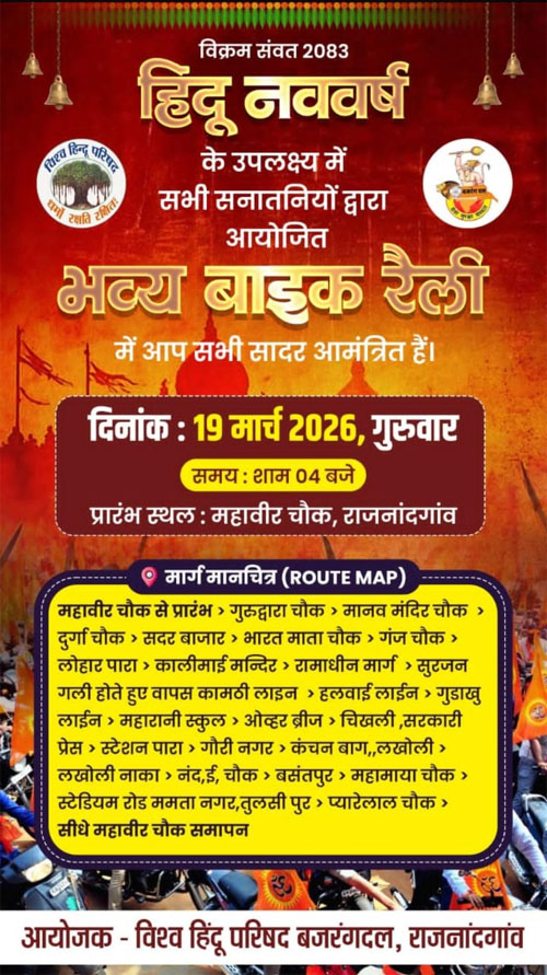 राजनांदगांव। 19 मार्च, गुरुवार को विश्व हिंदू परिषद और बजरंग दल की ओर से हिंदू नव वर्ष के अवसर पर भव्य मोटरसाइकिल रैली आयोजित की जाएगी। रैली का उद्देश्य समाज में नव वर्ष के प्रति उत्साह और सांस्कृतिक एकता का संदेश फैलाना बताया गया है।